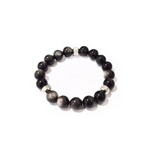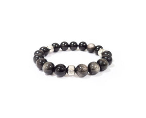 Silver Obsidian Bracelet with Decorative Stainless Steel Charms, Semiprecious Stone Jewelry