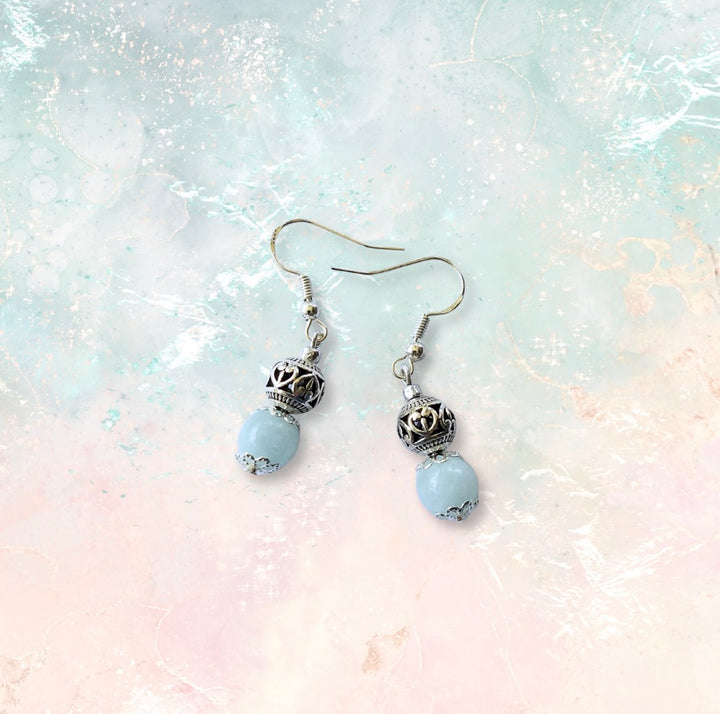 Materials: These handmade earrings are made of natural Aquamarine rounded beads with beautiful silver charm and 925 sterling silver ear hooks.