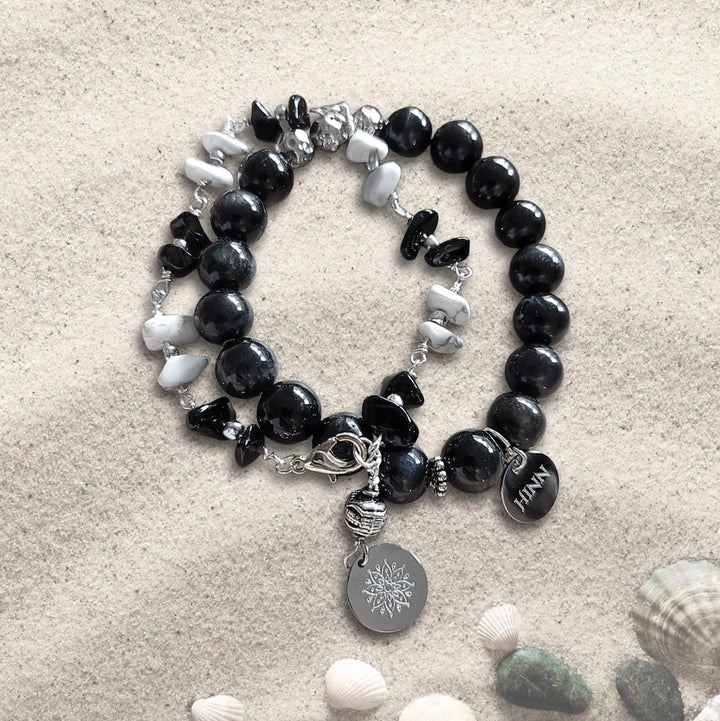 Onyx and Howlite Stone Bracelet with Decorative Silver Charm, Semiprecious Stone Jewelry