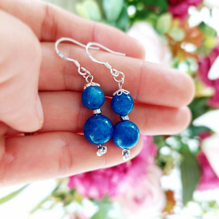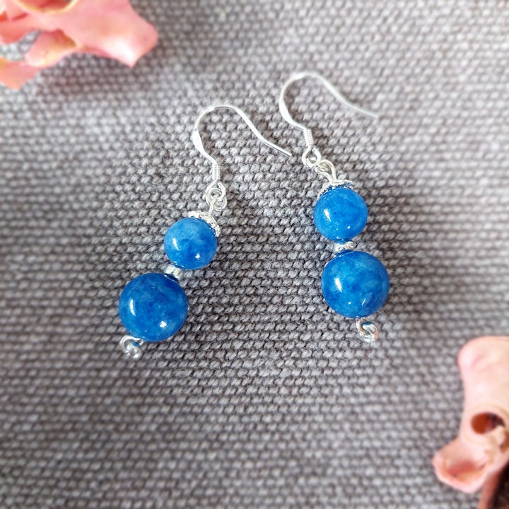 Drop earrings with blue Kyanite round beads, set in 925 sterling silver ear hooks. Designed in Thailand and handmade by artisans.