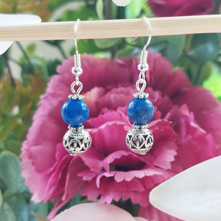 Materials: These gorgeous handmade earrings are made of natural blue Kyanite rounded beads with beautiful silver charm and 925 sterling silver ear hooks.