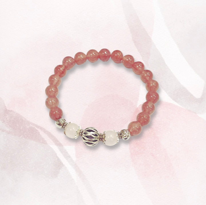 Strawberry Quartz Bracelet with Rose Quartz and Decorative Silver Charm, Semiprecious Stone Jewelry